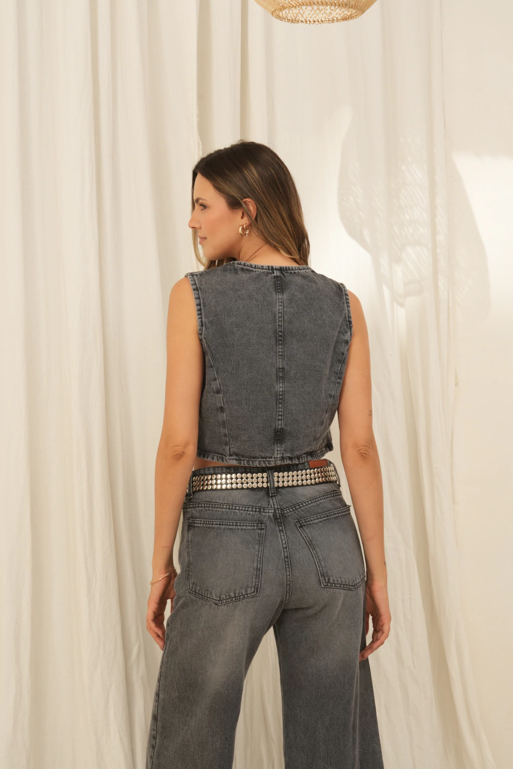 Chaleco Helena, el item ideal para estos dias. Confeccionado en denim rigido sin spandex, de largo modular por debajo de la cintura. Como acceso tiene 3 botones metalicos en el delatero.