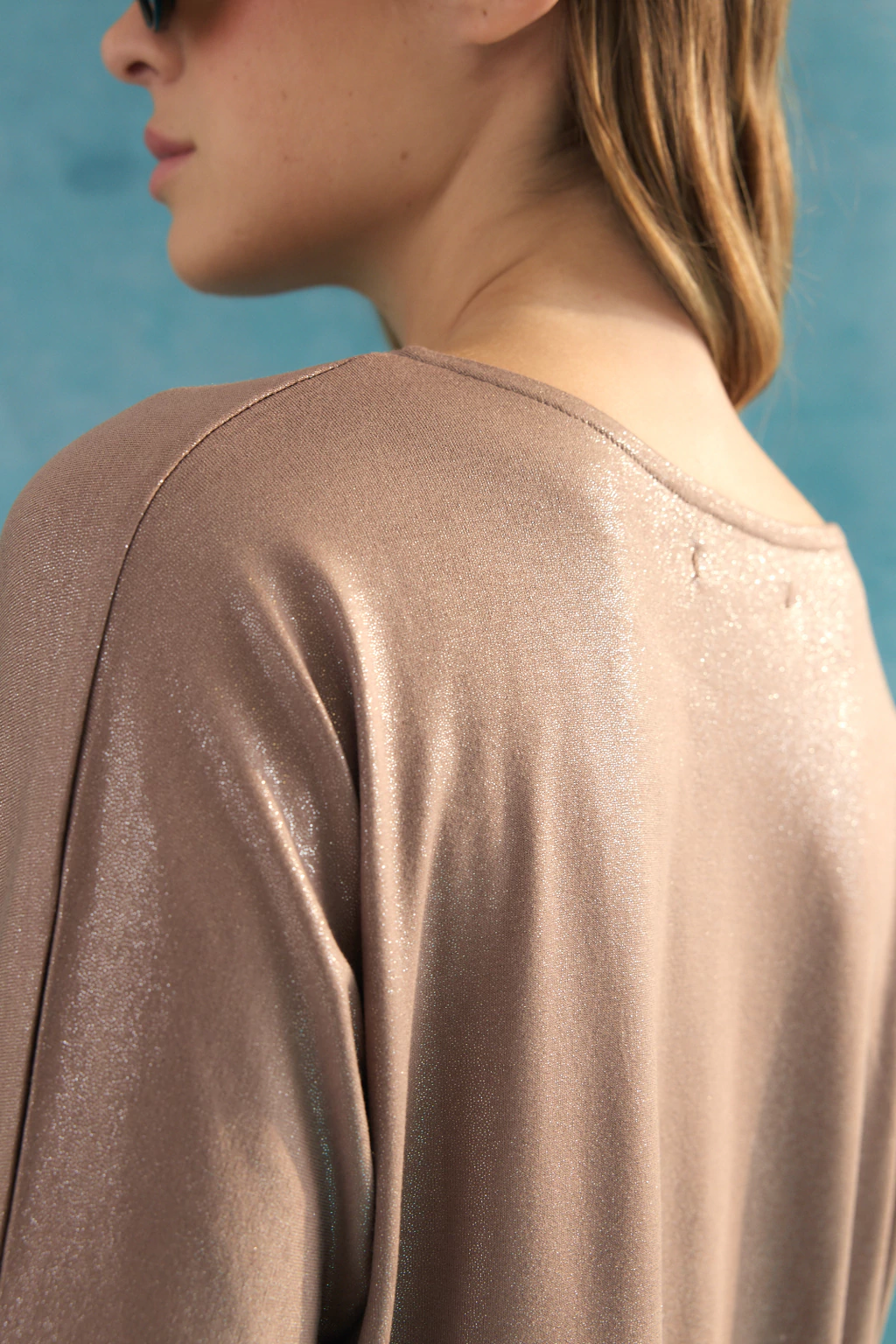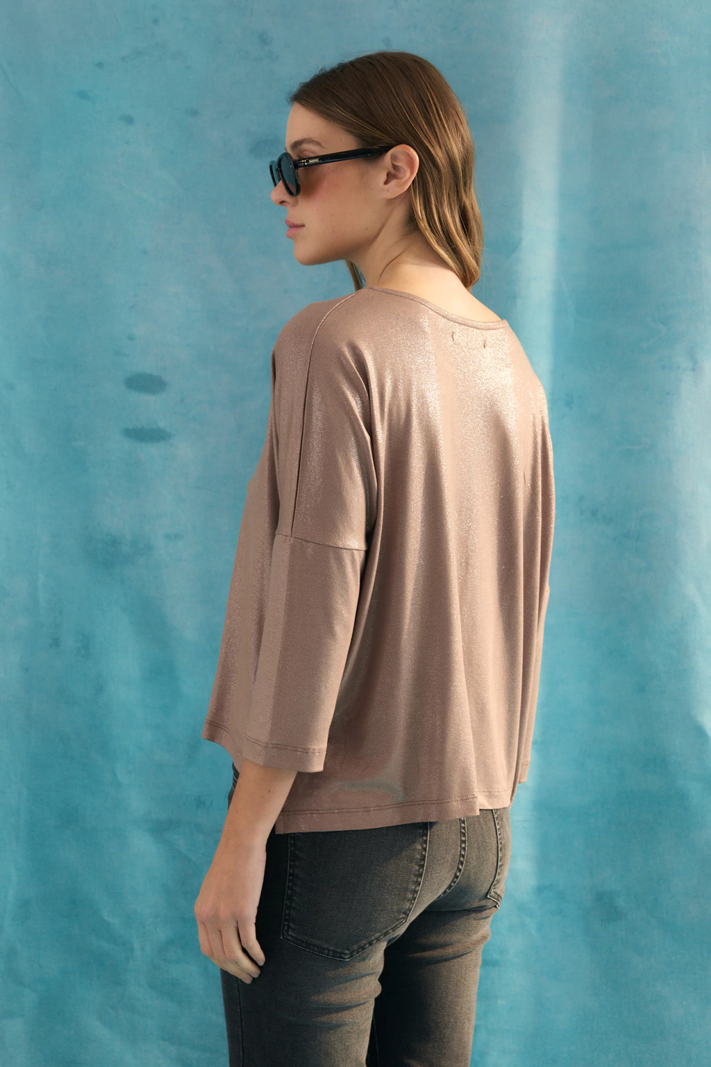Aca les presentamos el remeron bling, manga 3/4, escote redondo, el delantero es mas corto que la espalda y tiene tajos en los laterales. Hecho en viscosa con lurex, esta misma es super suave al tacto y tiene una caida espectacular.